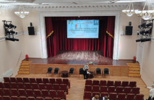 Сцена оборудована моторизированным проекционным экраном (проектор и пульт управления находятся на балконе рядом со звукорежиссером)